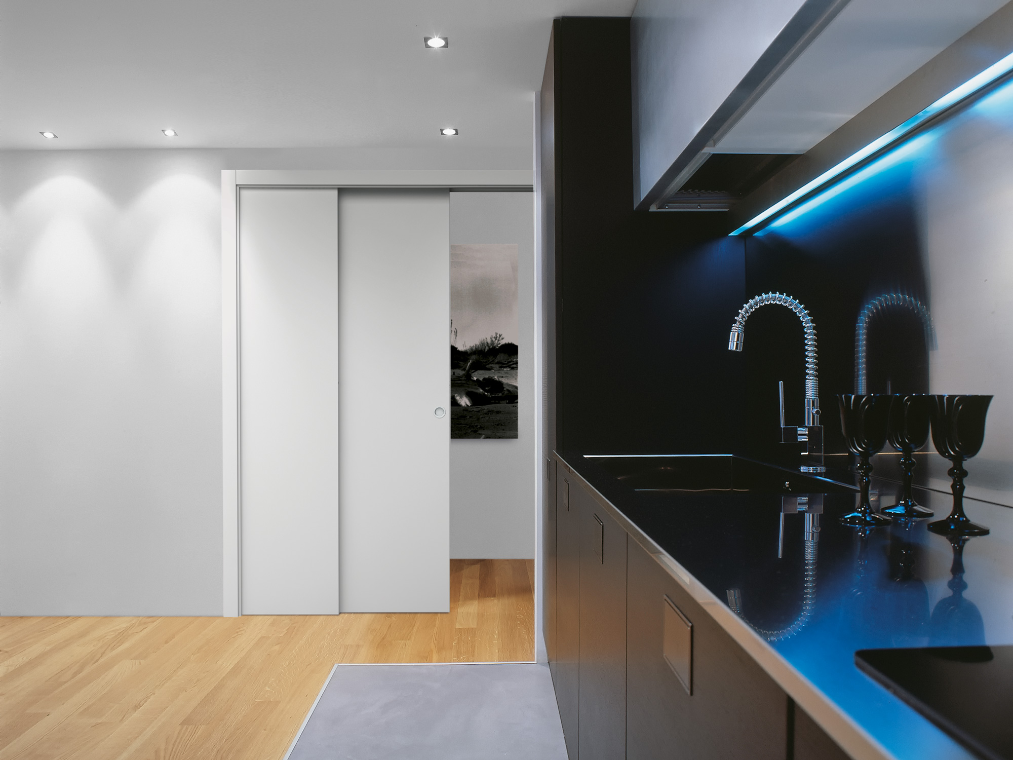 ECLISSE Telescopica permette la scomparsa di due ante scorrevoli parallele che scorrono in un unico controtelaio. Con un semplice gesto la prima accompagna la seconda fino alla totale apertura. Le due stanze diventano così, all’occorrenza, un unico grande volume, capace di accogliere tutta la luce dell’ambiente circostante.