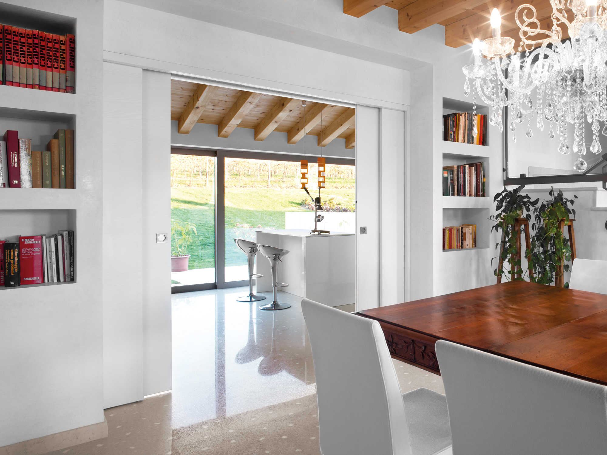 ECLISSE Telescopica Estensione permette la scomparsa di due coppie di ante scorrevoli parallele che scorrono in due cassoni speculari in un unico controtelaio. Le due stanze diventano così, all’occorrenza, un unico grande volume, capace di accogliere tutta la luce dell’ambiente circostante.