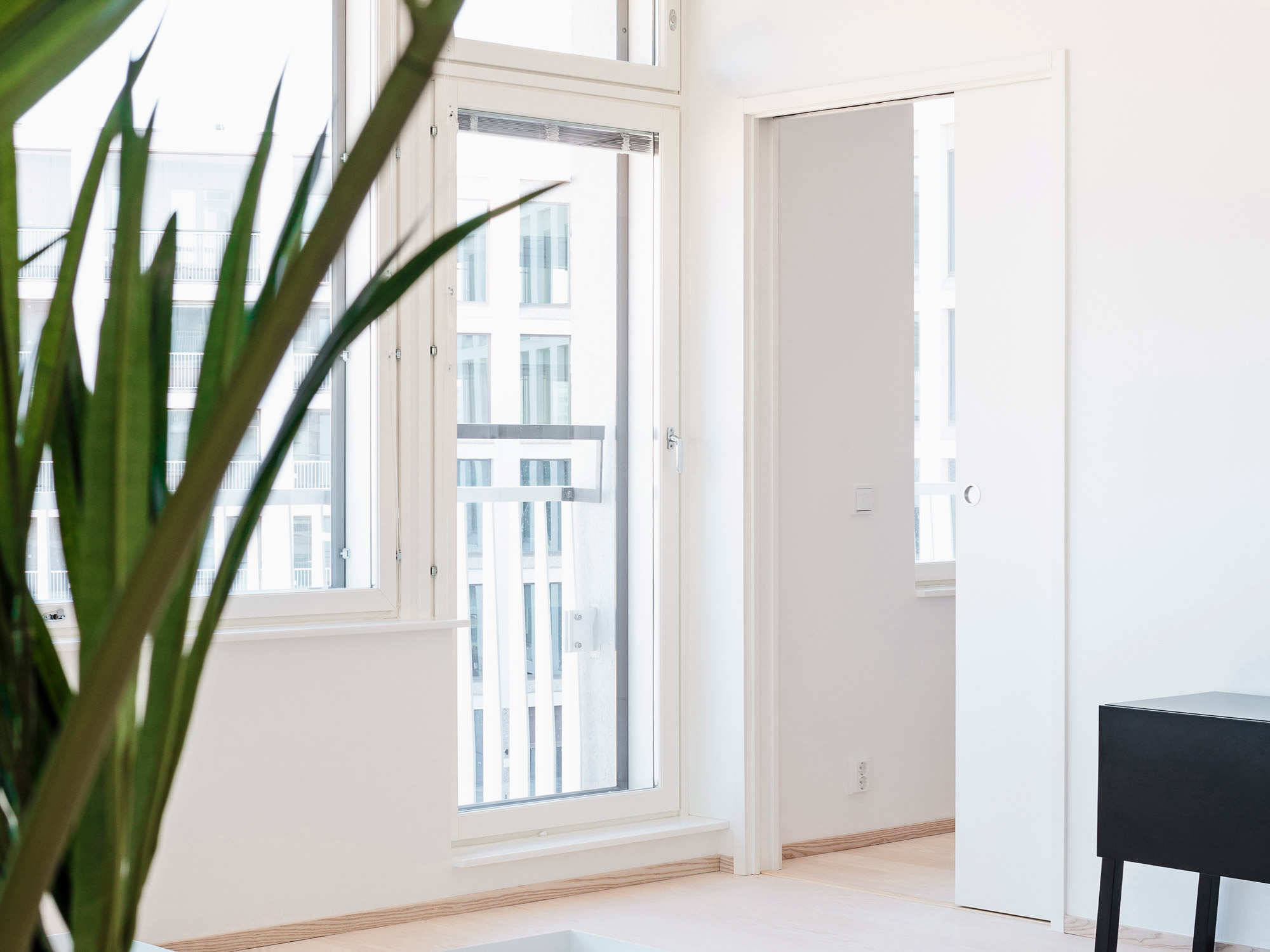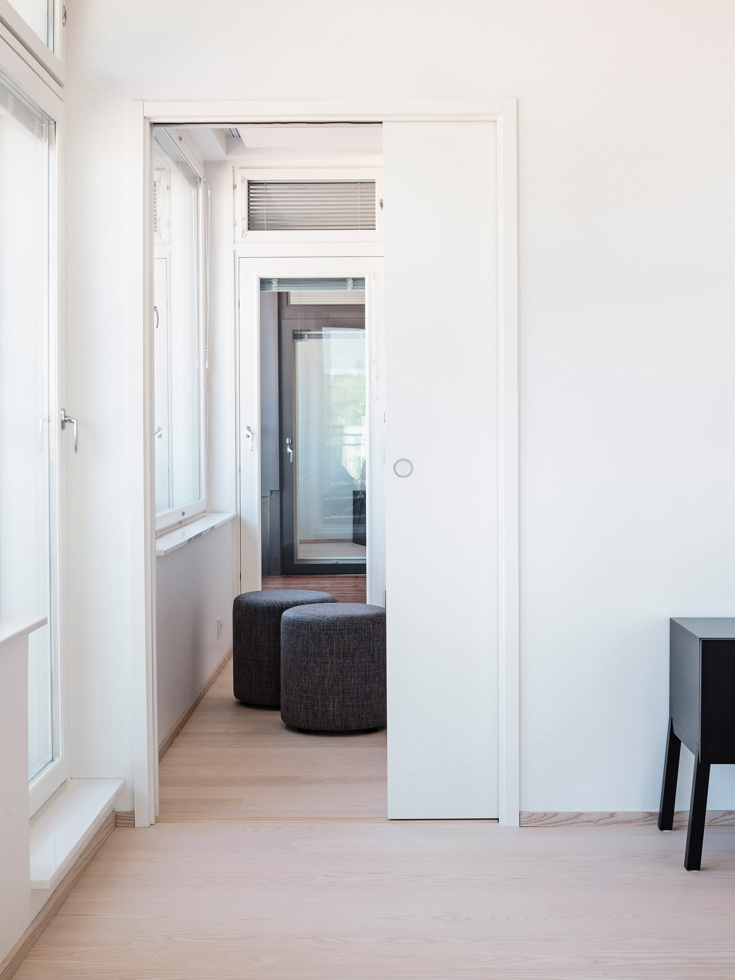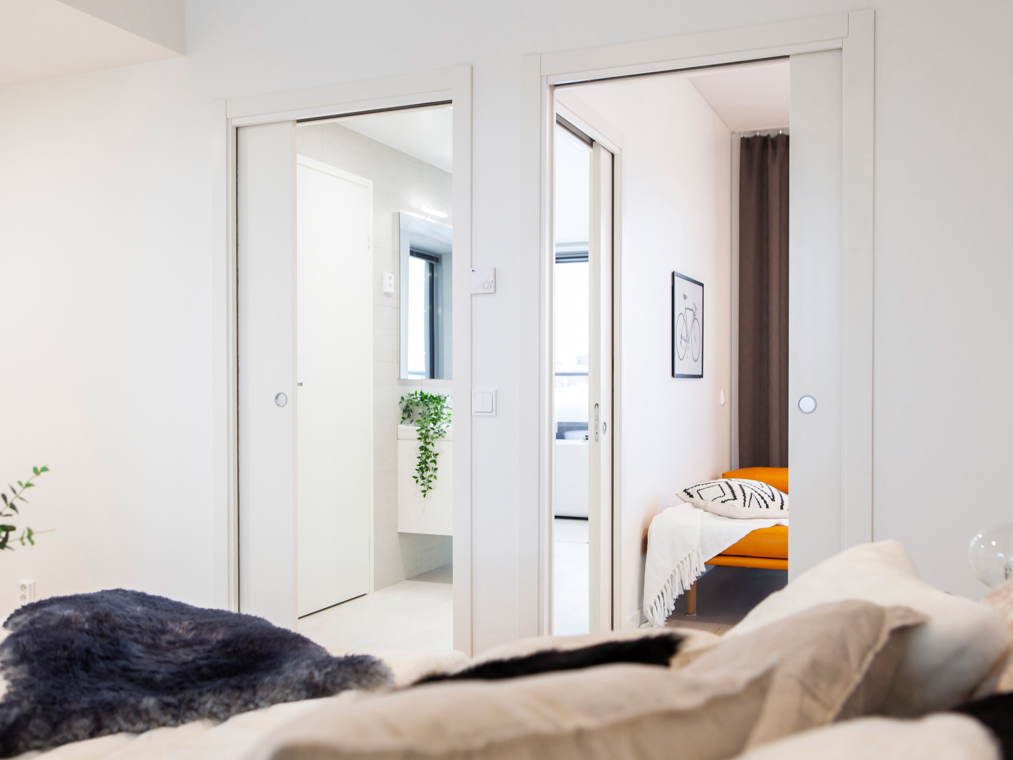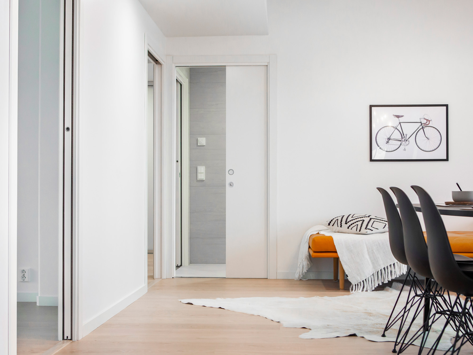 Una porta a scomparsa si apre senza occupare spazio, lasciando libera la parete e senza alcun ingombro in apertura. Una soluzione funzionale che svincola il progetto e lascia spazio alla fantasia.