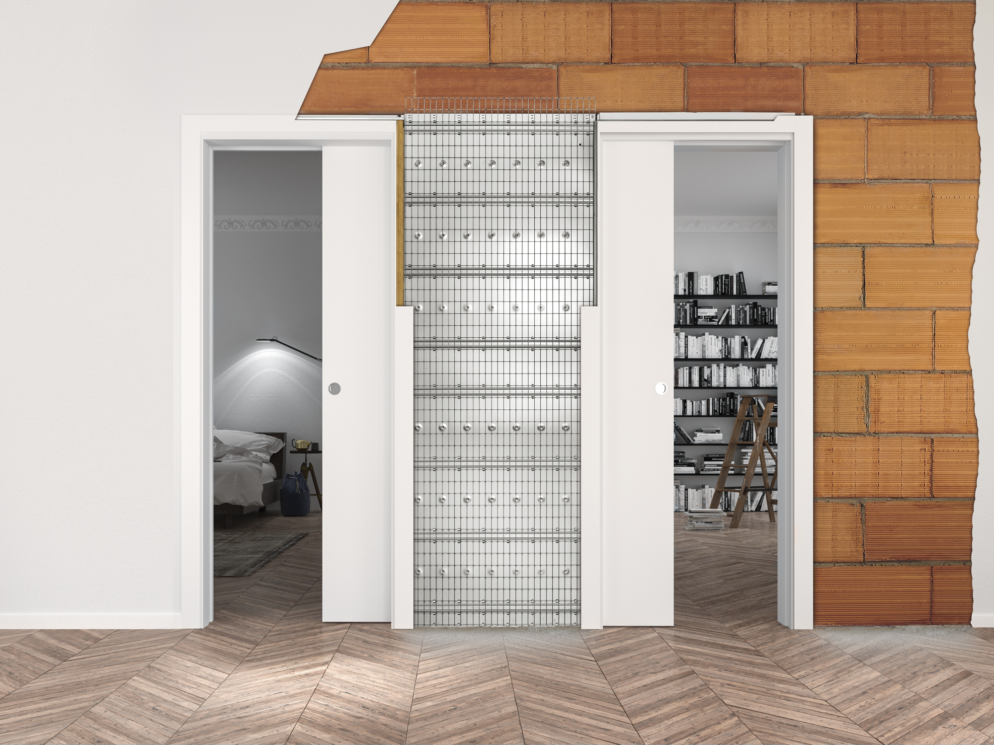 Controtelaio per due porte scorrevoli a scomparsa indipendenti e contrapposte