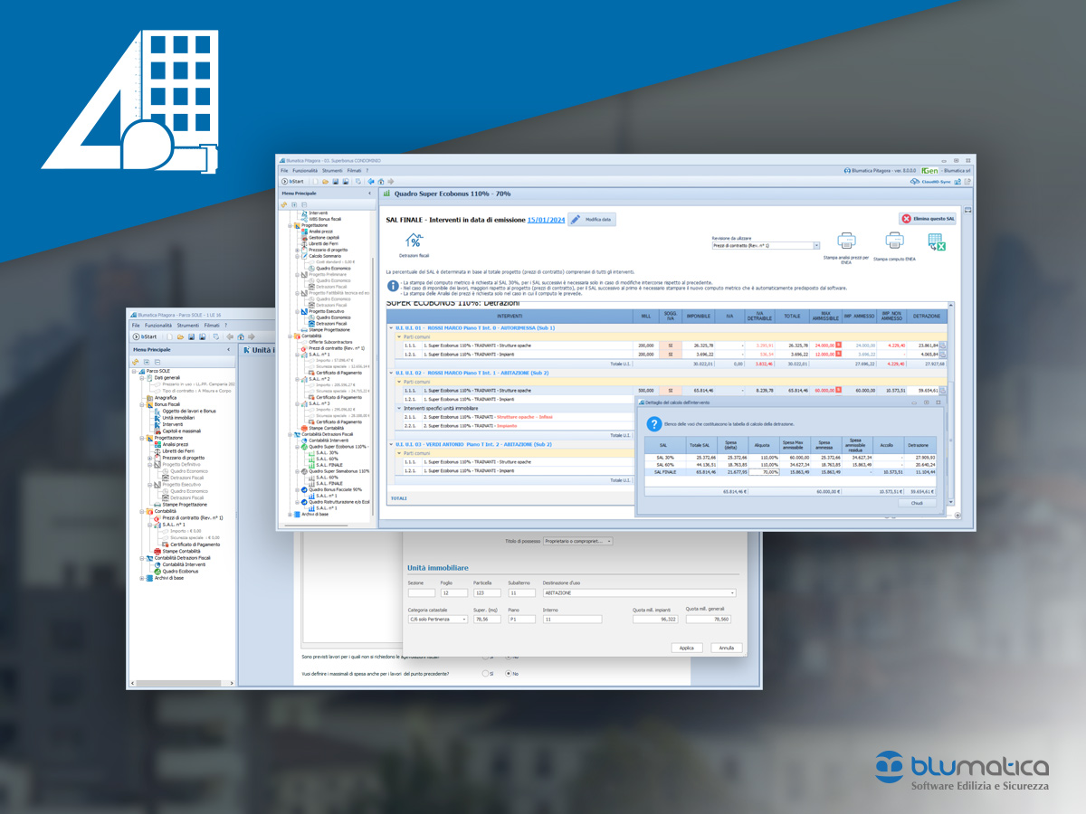 Per ogni fase della contabilità (computo preliminare, definitivo, esecutivo, prezzi di contatto, SAL e varianti in corso d’opera) disponi del calcolo integrato delle detrazioni fiscali, dell'accollo spesa e dell'IVA detraibile per ogni contribuente/unità immobiliare.