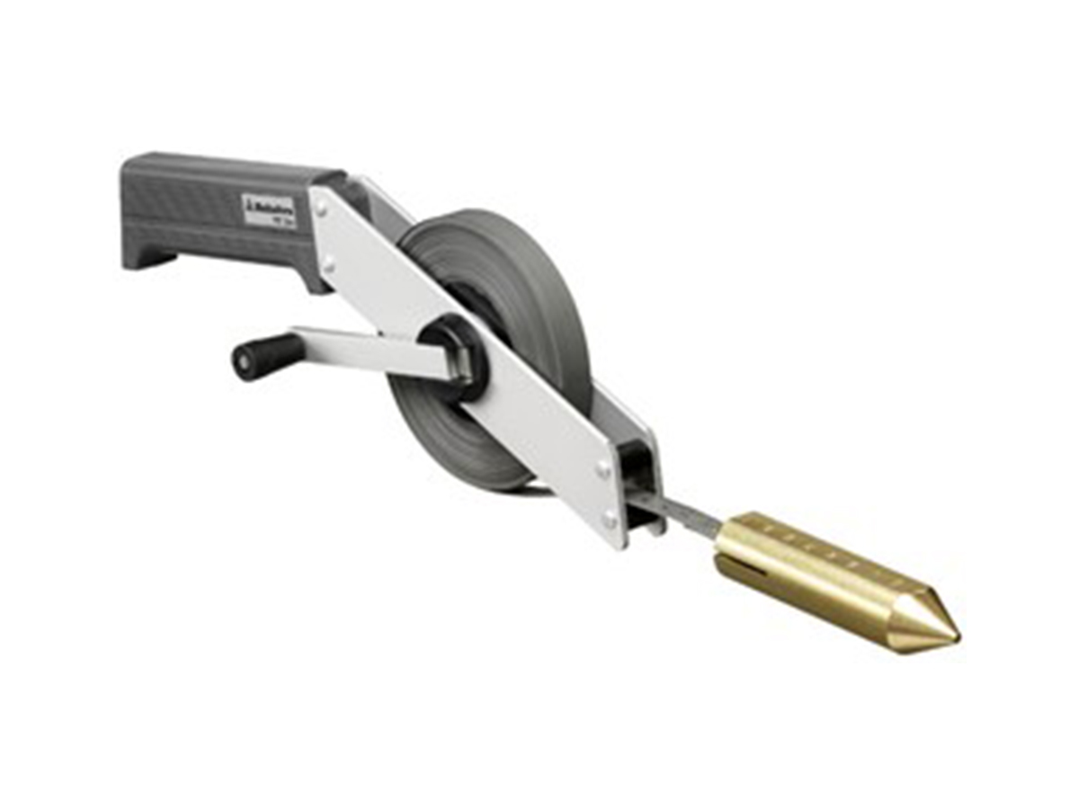Rotella metrica a nastro in acciaio inossidabile acidato, largo 13 mm, graduato in millimetri e con telaio in alluminio. Il nastro presenta nella sua parte terminale un peso a punta in ottone studiato per procedere alla misurazione di profondità, ad esempio di pozzi o cisterne.