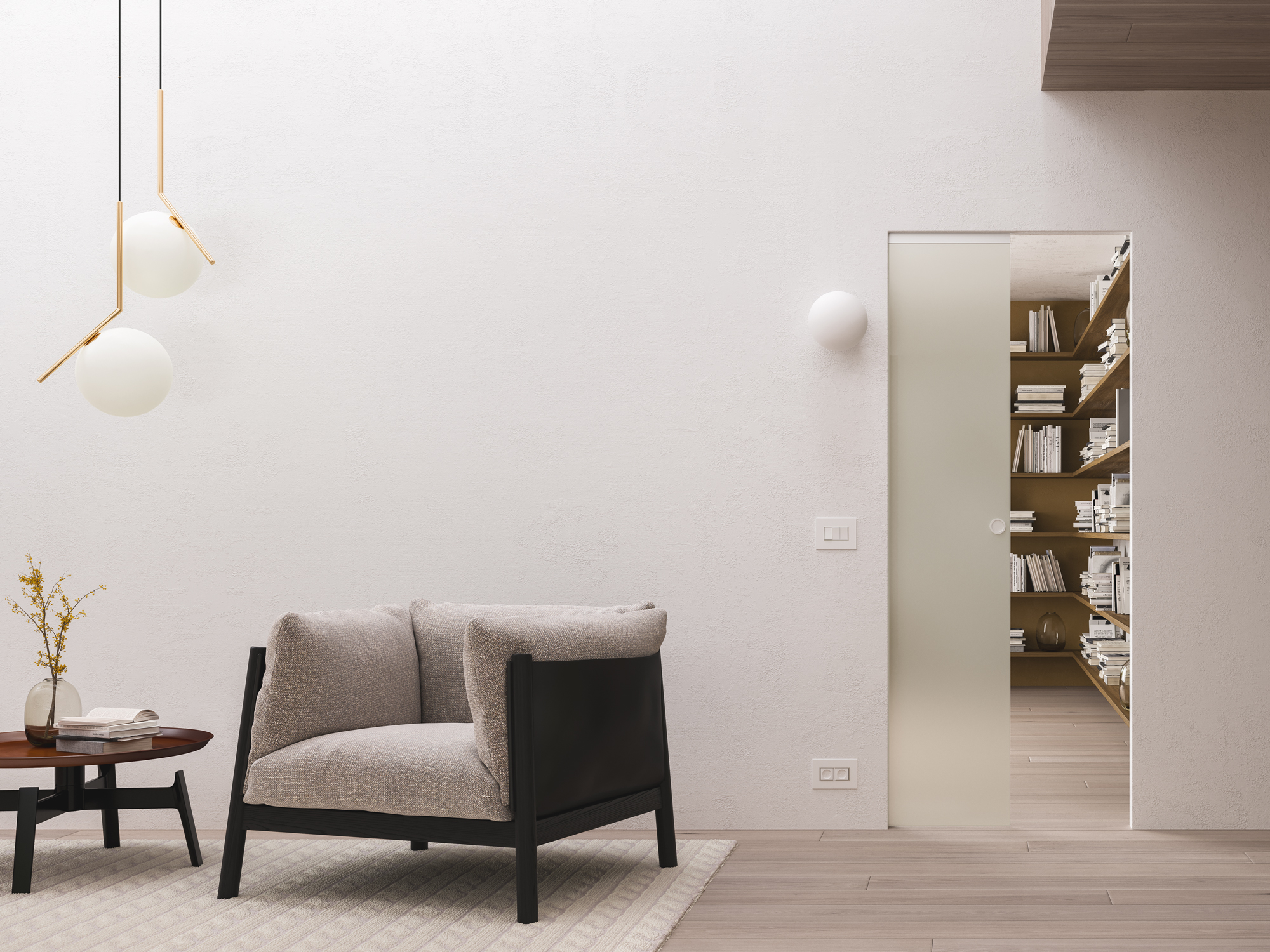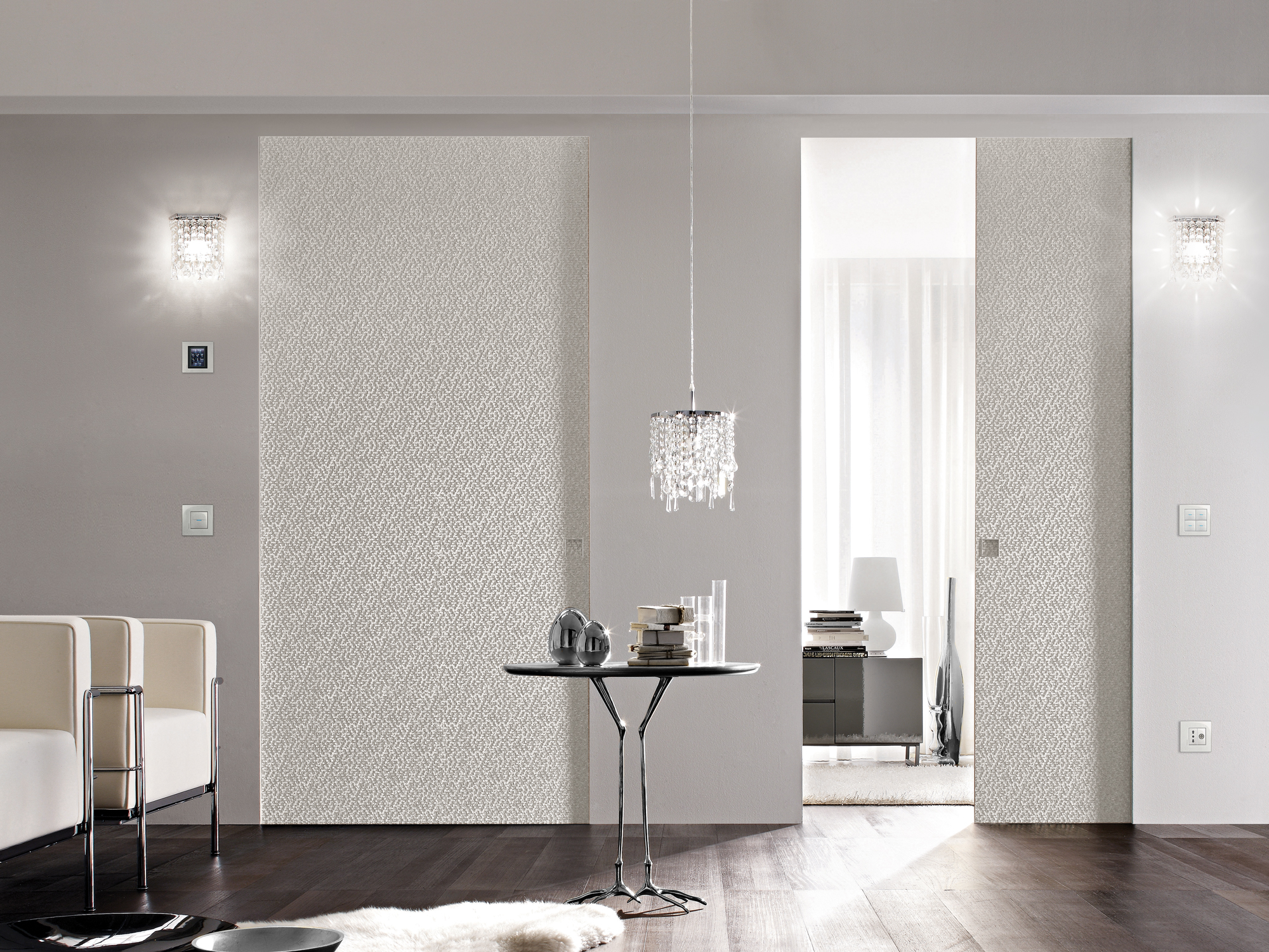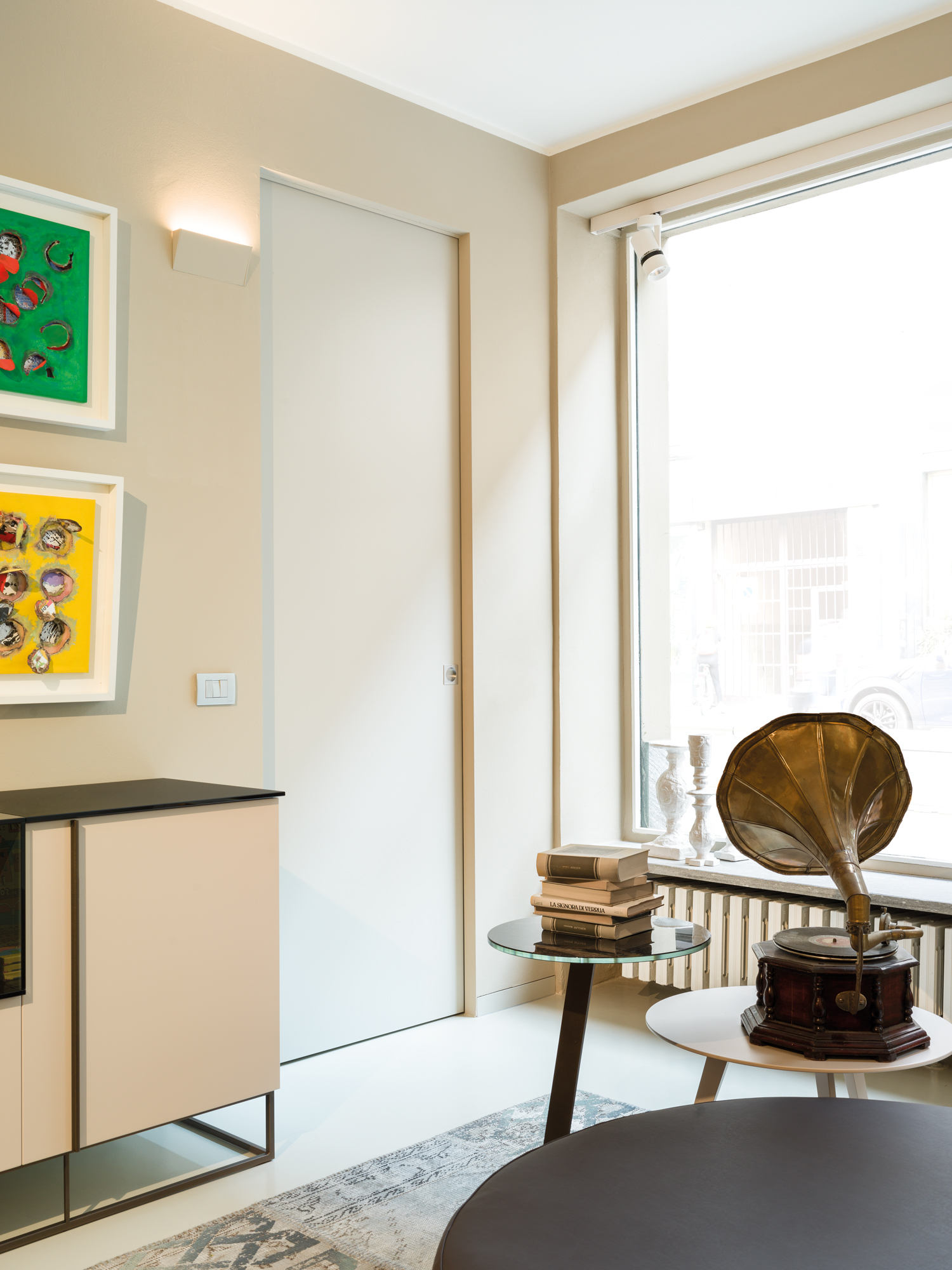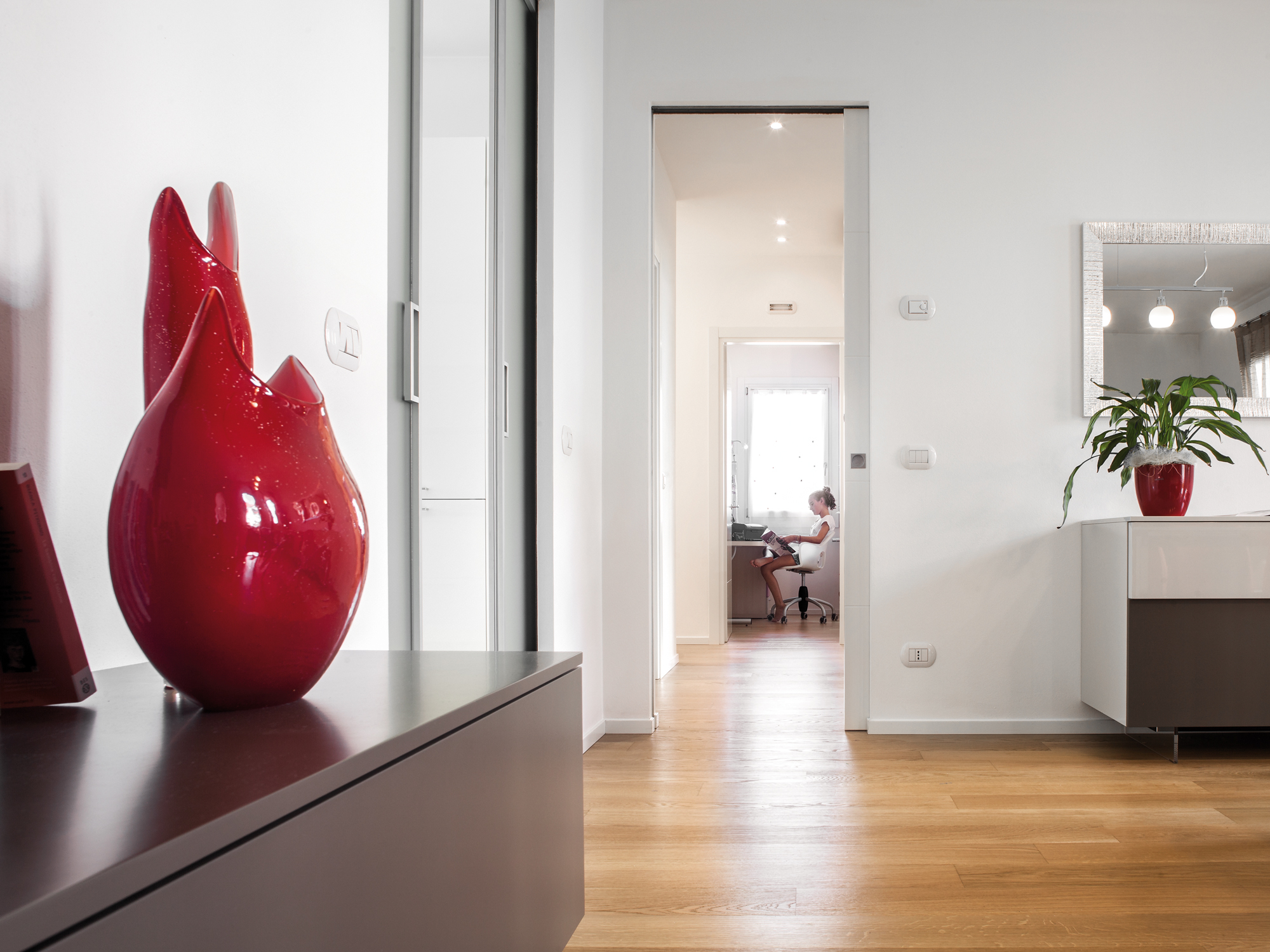 L’assenza di stipiti favorisce l’integrazione con la parete: dettagli costruttivi come i profili perimetrali resinati facilitano l’applicazione di intonaco e stucco sul perimetro del foro porta e rendono la struttura completamente invisibile e integrata nel muro.